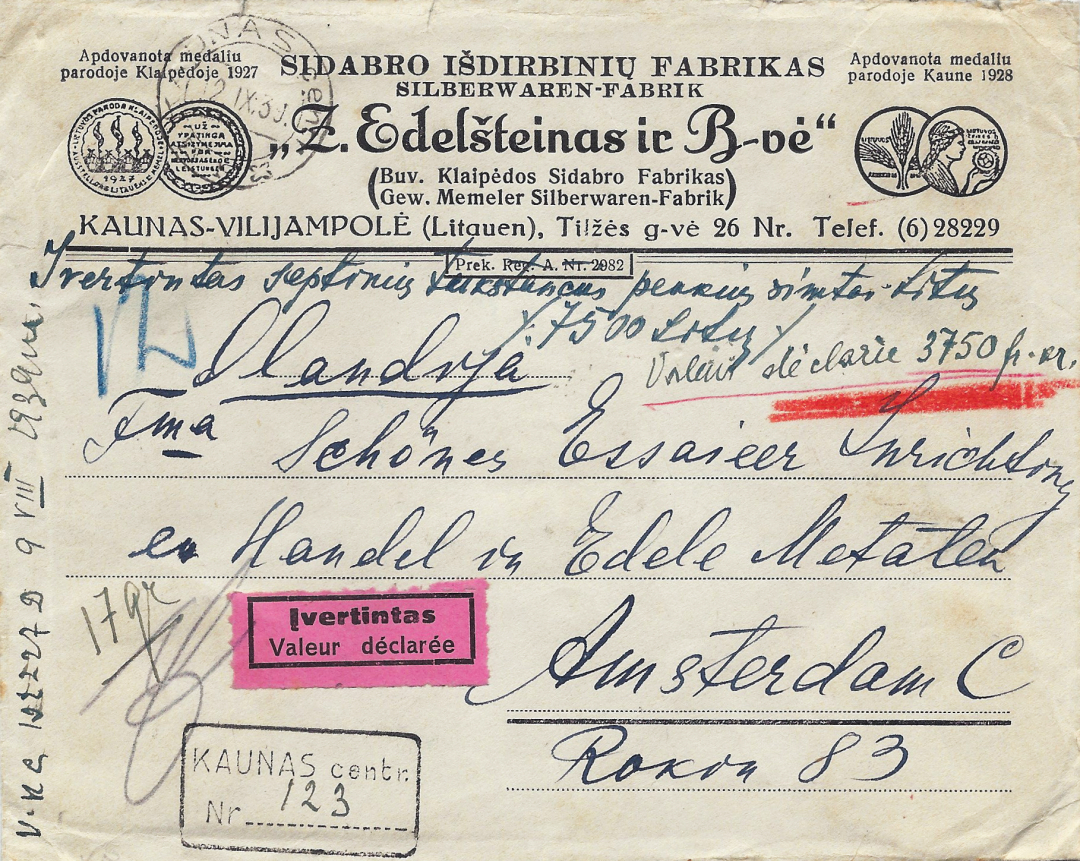 Hier ein Beispiel: Wertbrief von September 1939 in die Niederlande, Gewicht 17 gr, Wertangabe: 7.500 Litas = 3.750 Goldfranken.