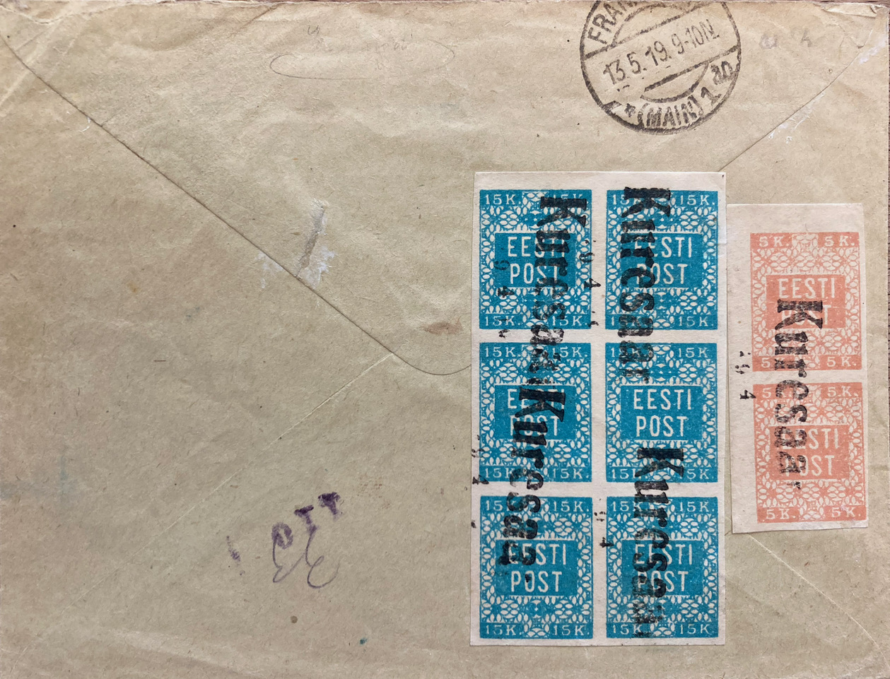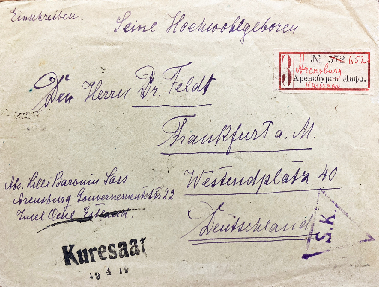 Dieses Einschreiben aus Arensburg auf der estnischen Insel Saaramaa (nicht zu verwechseln mit Ahrensburg nördlich Hamburg) vom 19.04.1919 nach Frankfurt/Main (Ankunft 13.05.1919) fällt auf durch den Zeilenstempel "Kuresaar" nebst Datumstempel und den handschriftlich überschriebenen R-Zettel.