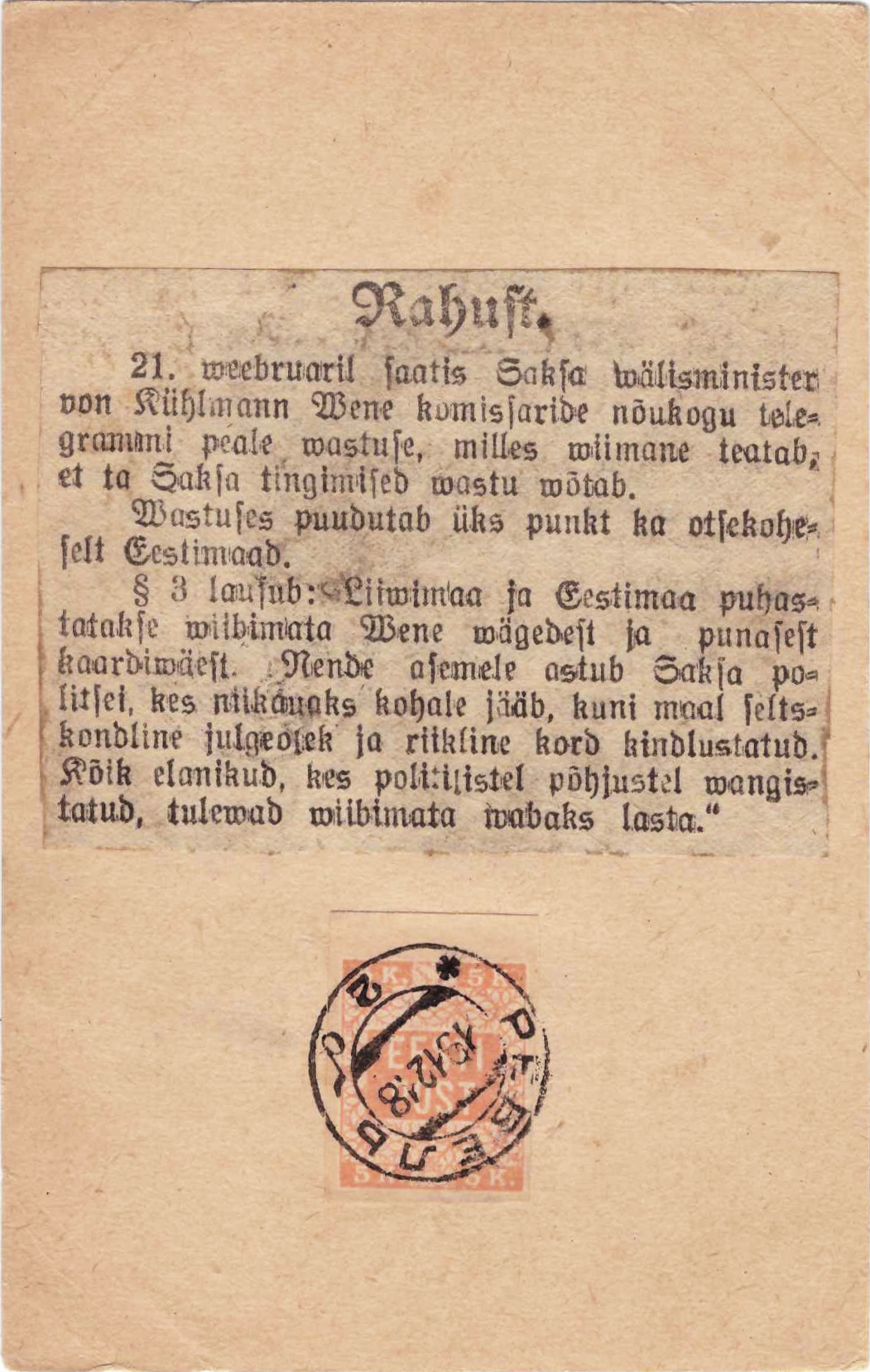 Am 21. Februar (1918) sandte der deutsche Außenminister von Kühlmann eine Antwort auf das Telegramm des Rates der russischen Kommissare, in dem letztere mitteilten, dass sie die deutschen Bedingungen (des Rückzuges aus Estland) annehmen.